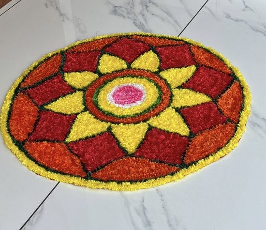 Bring home the vibrant spirit of Kerala festivals with our Festive Bloom Pookalam. This design showcases a layered petal arrangement in alternating red, yellow, and white tones, all encased in a rich green border. The perfect mix of color, symmetry, and tradition, this floral artwork is ideal for making your celebrations more colorful and auspicious.