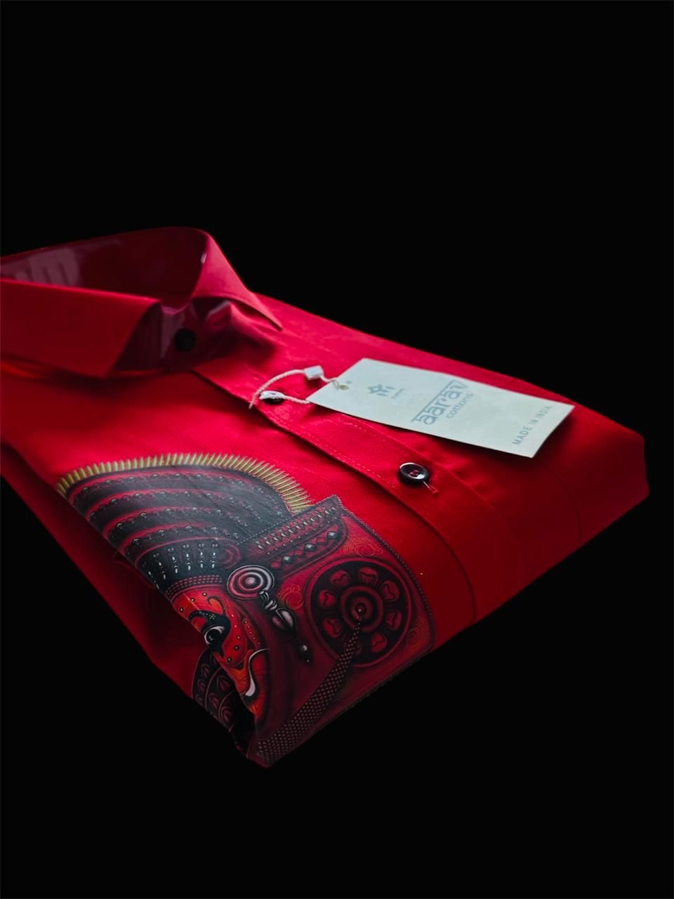 Tis vibrant red shirt blends heritage and fashion with powerful visual appeal. Crafted from soft, breathable cotton, it features an intricate Theyyam face print – representing Kerala’s ancient ritual dance form known for its dramatic colors and symbolism. Designed for both comfort and cultural pride, this shirt is perfect for festivals, cultural programs, or statement daily wear. Design Highlights: Detailed Theyyam face artwork on the front Rich red base that enhances the traditional print Regular or mandarin collar (selectable style) Full-length buttoned front and a neat chest pocket Tailored finish with clean stitching Make a bold cultural statement with every wear.